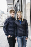 A modern jacket with down-like padding and softshell panels. 3 exterior pockets with zippers and 2 interior pockets. Earphone loop in the neck.