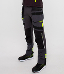93% polyester/7% elastane kingsmill fabric. Contrast panels 65% polyester/35% cotton ripstop. Four-way stretch. Part elasticated waistband with high rise back. Belt loops. Zip fly with button over. 16 pockets including two detachable holster pockets, side, rear and multi-functional thigh pockets. Contrast zips on pockets with branded zip pulls. Top loading two tier knee pad pockets to allow for positioning options - knee pads included. Lightweight, flexible HiVisTex Pro reflective tape on rear lower legs. Adjustable leg length reg 31" to tall 33". Triple needle stitching. Branding on right thigh pocket.