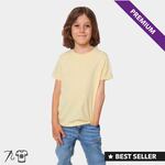 Set-in sleeve. 1x1 rib at neck collar. Inside back neck tape in self-fabric. Sleeve hem and bottom hem with narrow double topstitch. Kids, medium fit, short sleeve, round-neck. 100% organic ringspun combed cotton. Single Jersey. Fabric washed. Vegan certified. Fairwear Foundation certified. Oeko-Tex certified.